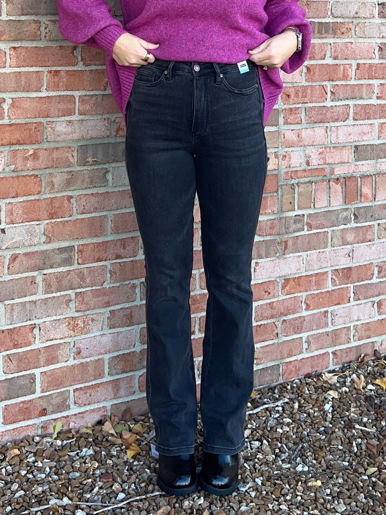 High waisted, black jeans by Judy Blue featuring a tummy control panel, bootcut hemline, classic pockets, hidden zipper fly and a single button closure. No distressing.