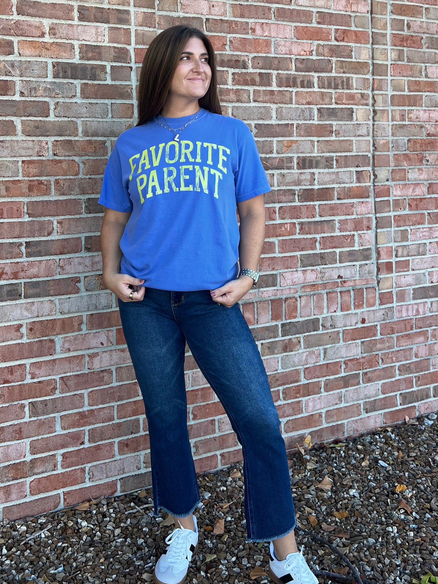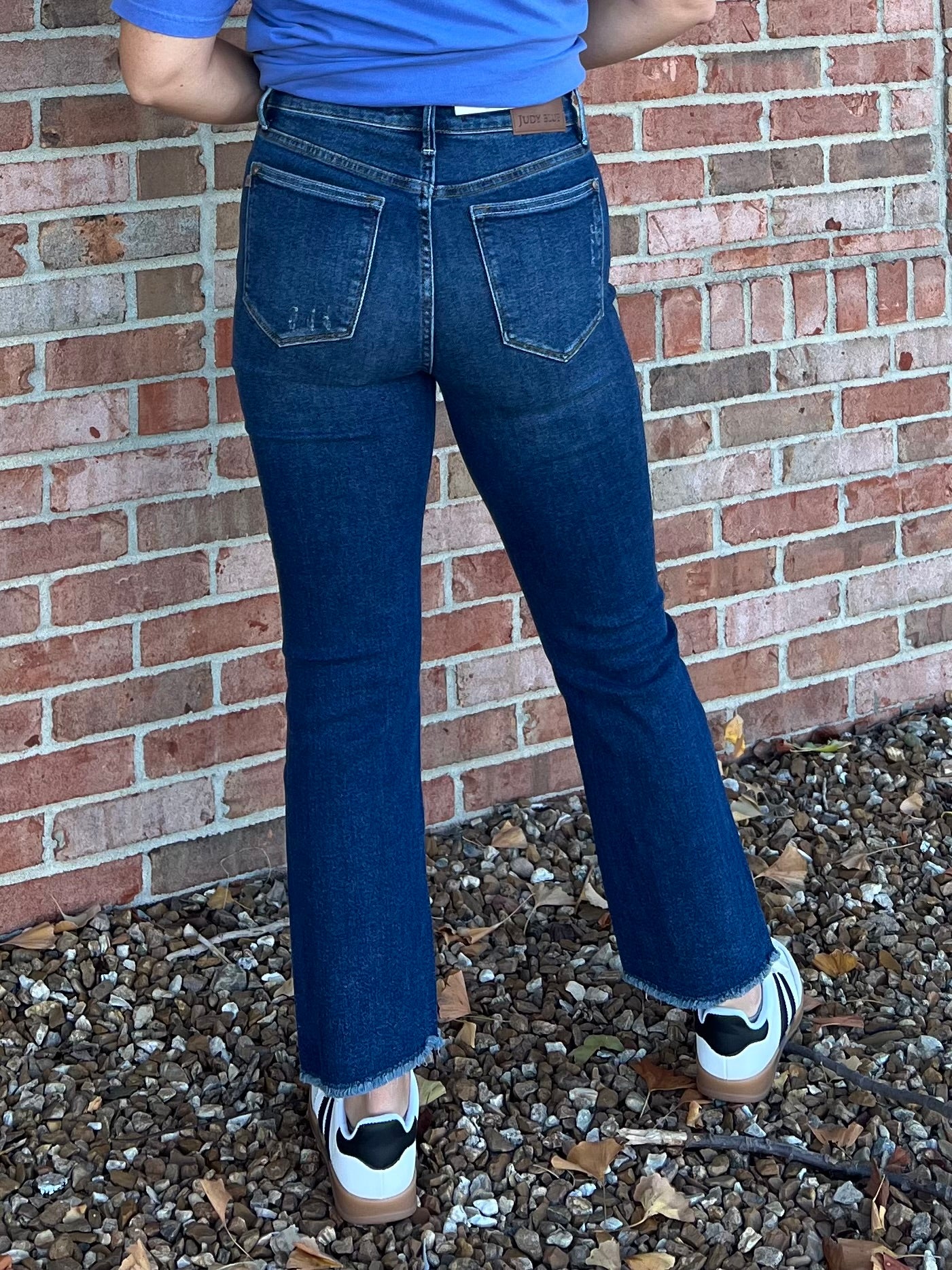 High waisted, dark wash jeans by Judy Blue featuring a kick flare and hi low, frayed hem. Classic 5 pocket, single button closure with hidden zipper.