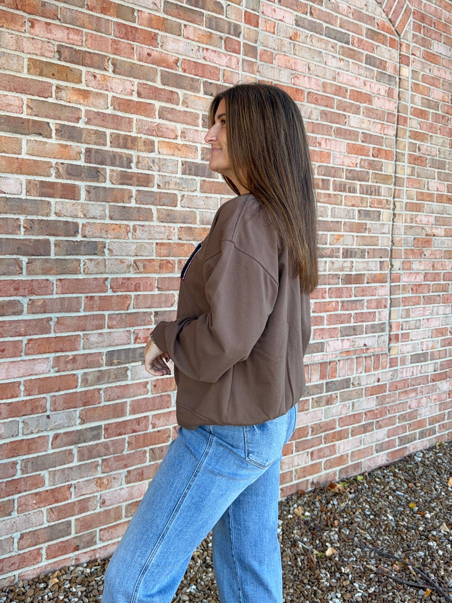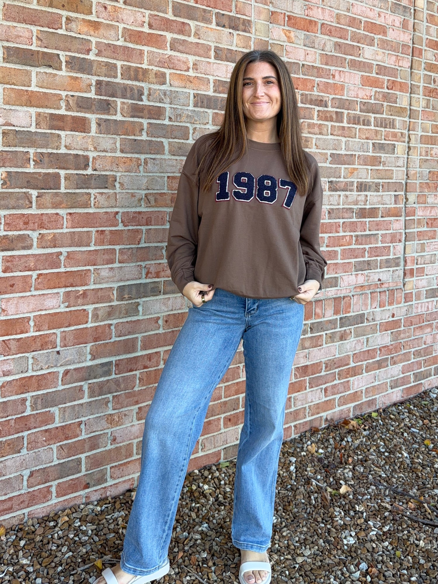 Long sleeve, knit top in dark brown with varsity style chenille numbers 1987 across the chest in navy and burgundy outline.