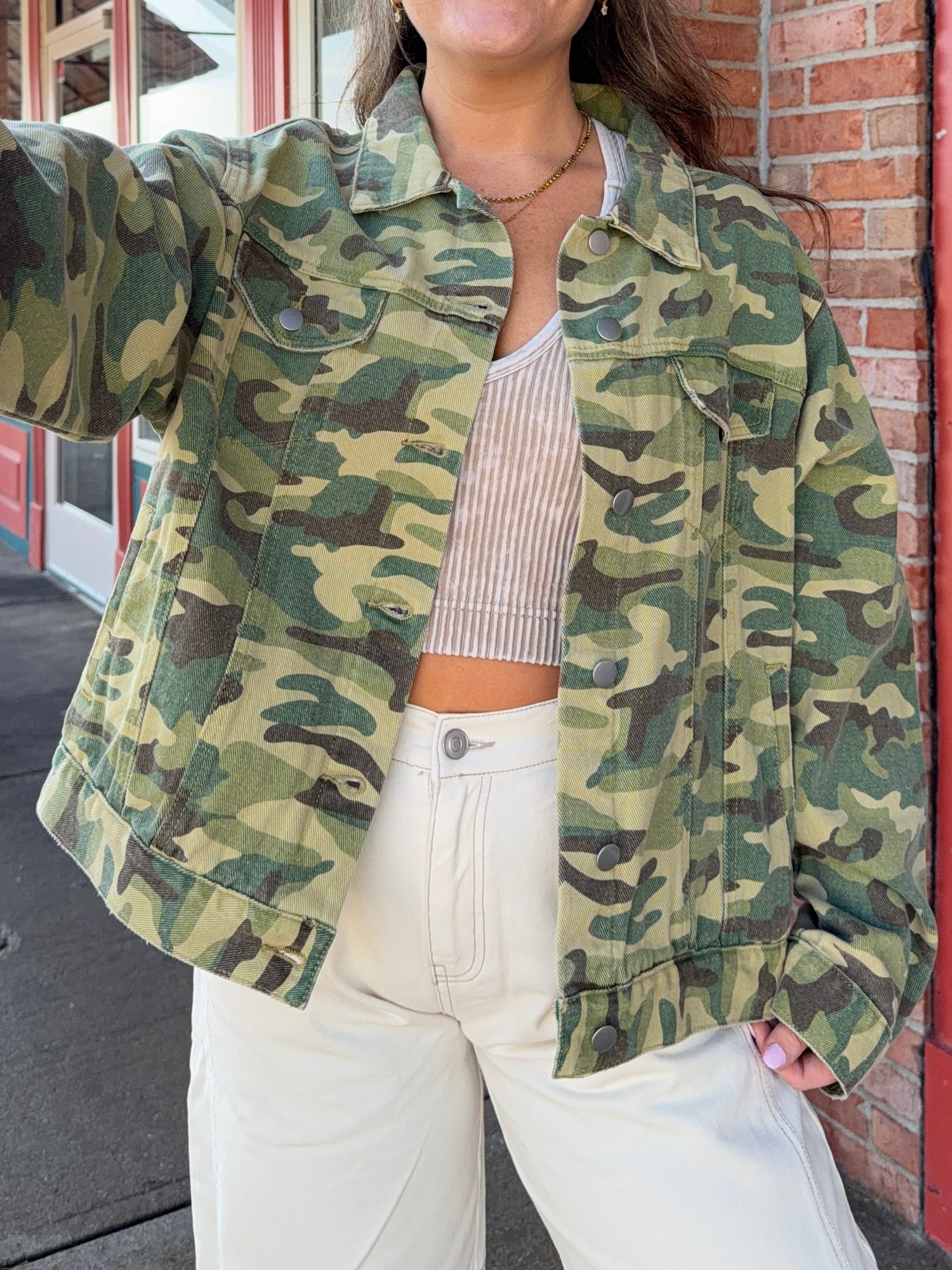Long sleeve, denim material jacket in a bright camo print. Silver hardware. Button front. Collared. Side pockets. Chest pockets. Small leopard print patch on bottom back.