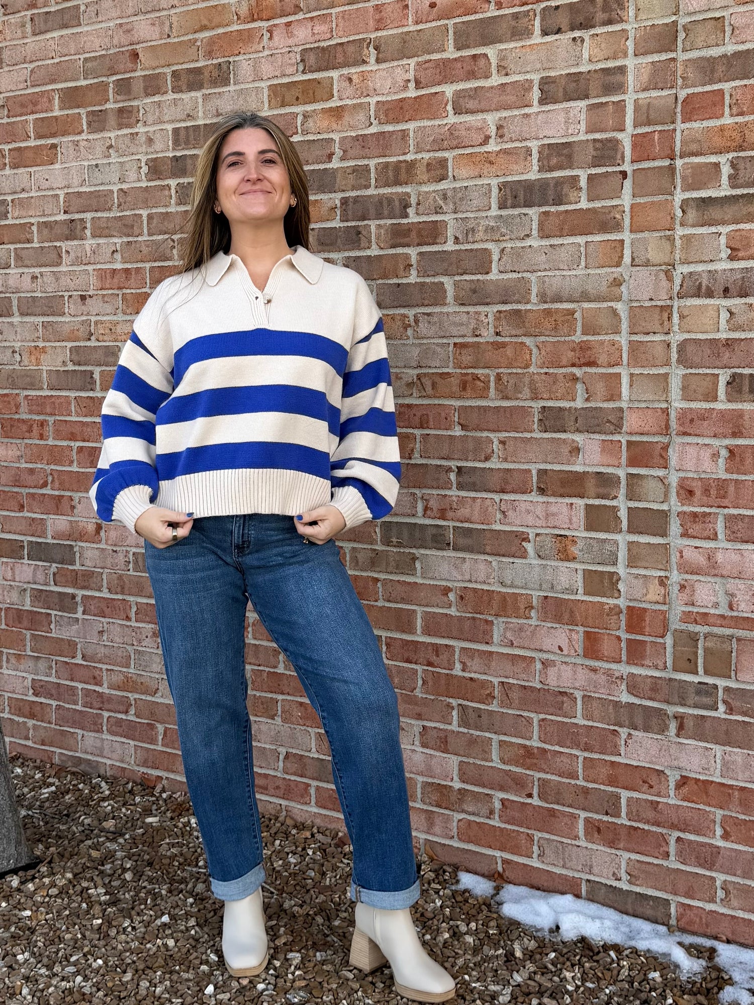 Long sleeve sweater with a collar and v neckline that buttons. Thick stripes of cobalt blue across the bottom half and sleeves. Beige base. Ribbed hemline and end of sleeves.