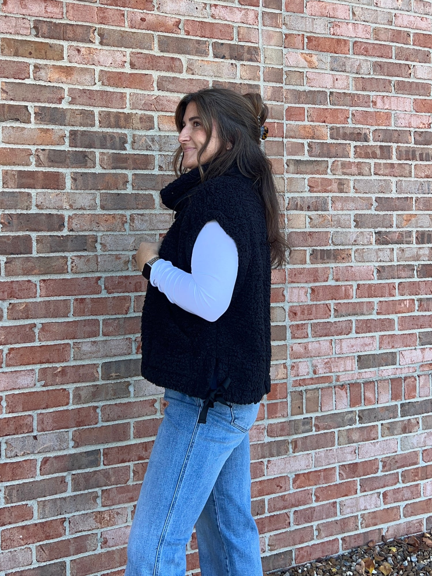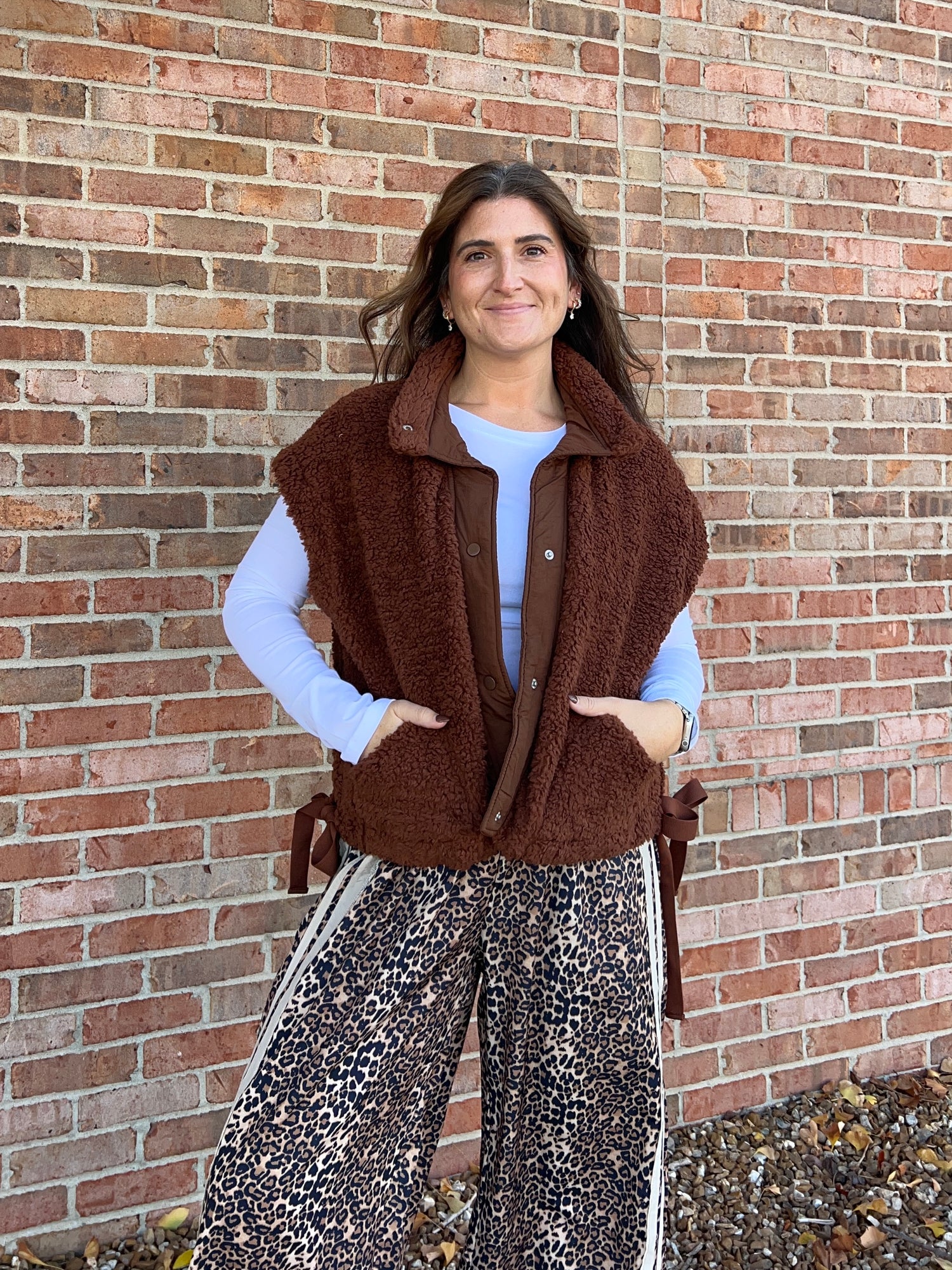 Oversized, faux fur vest that snap buttons up the front and ties on the sides. Pockets. Available in black and brown.
