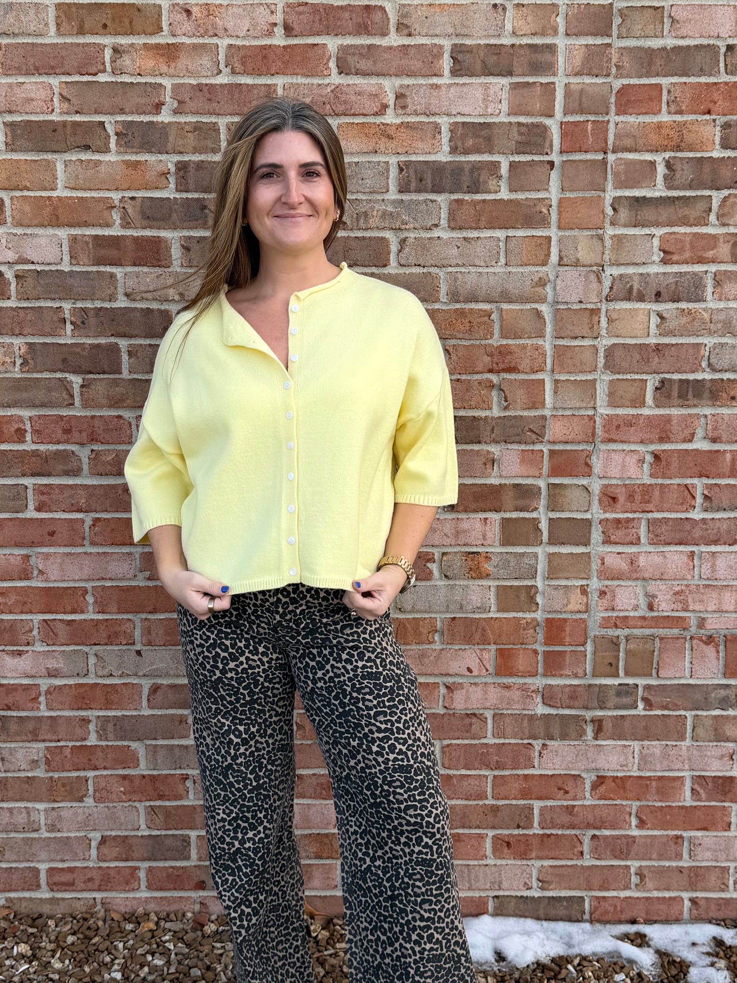 Half sleeve, button down cardigan with raw hem neckline and ribbed hemline. Buttons are ivory pearl plastic. Available in 3 colors.