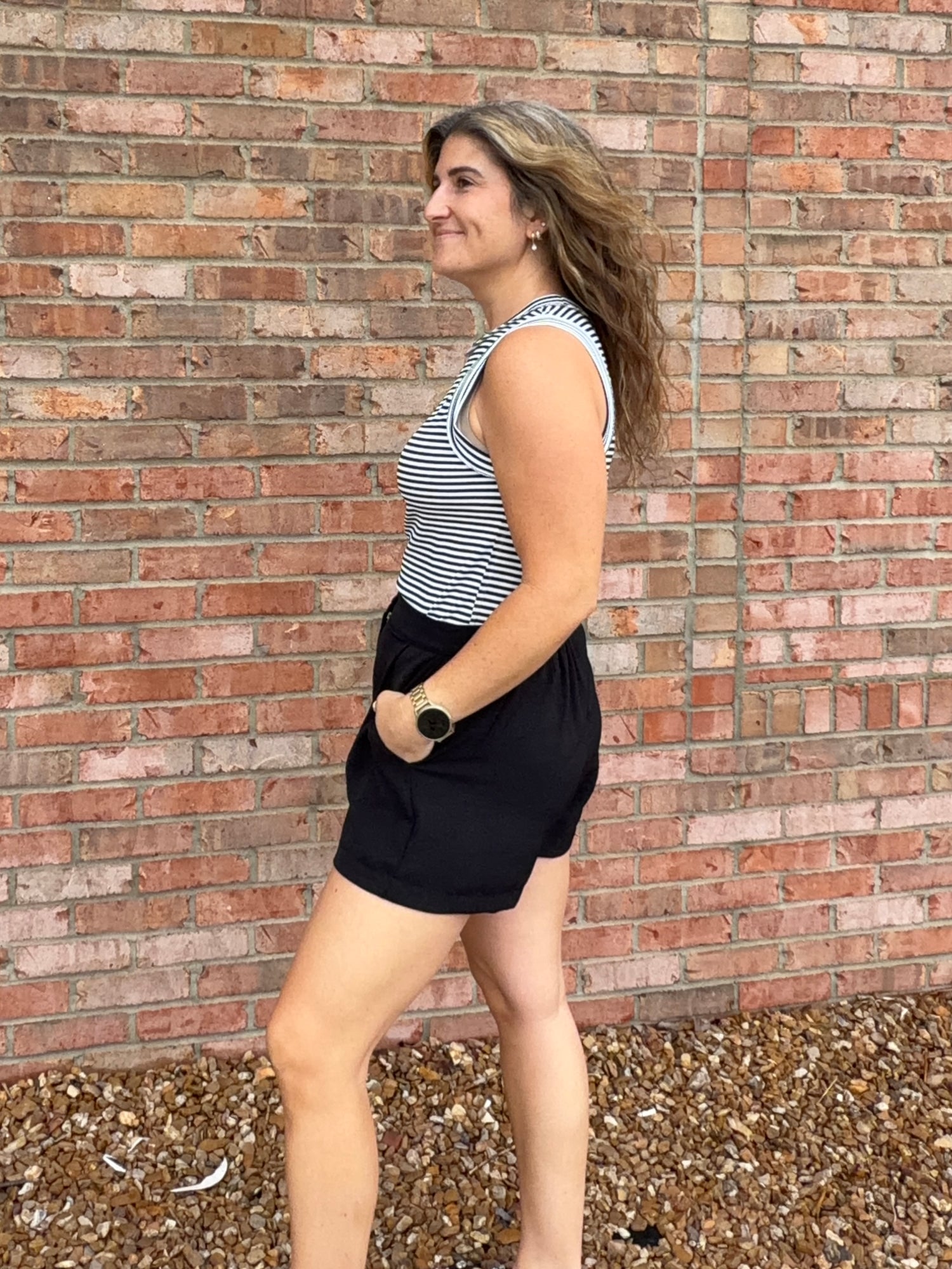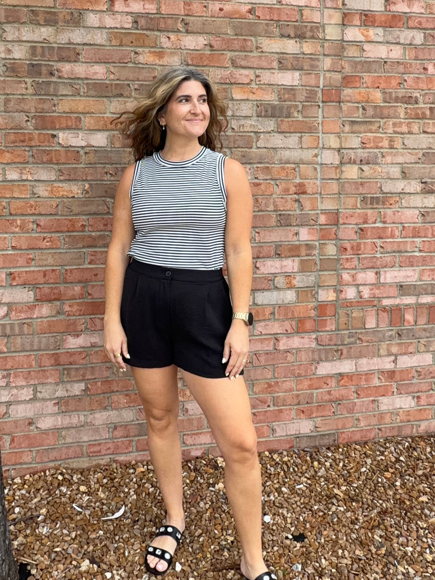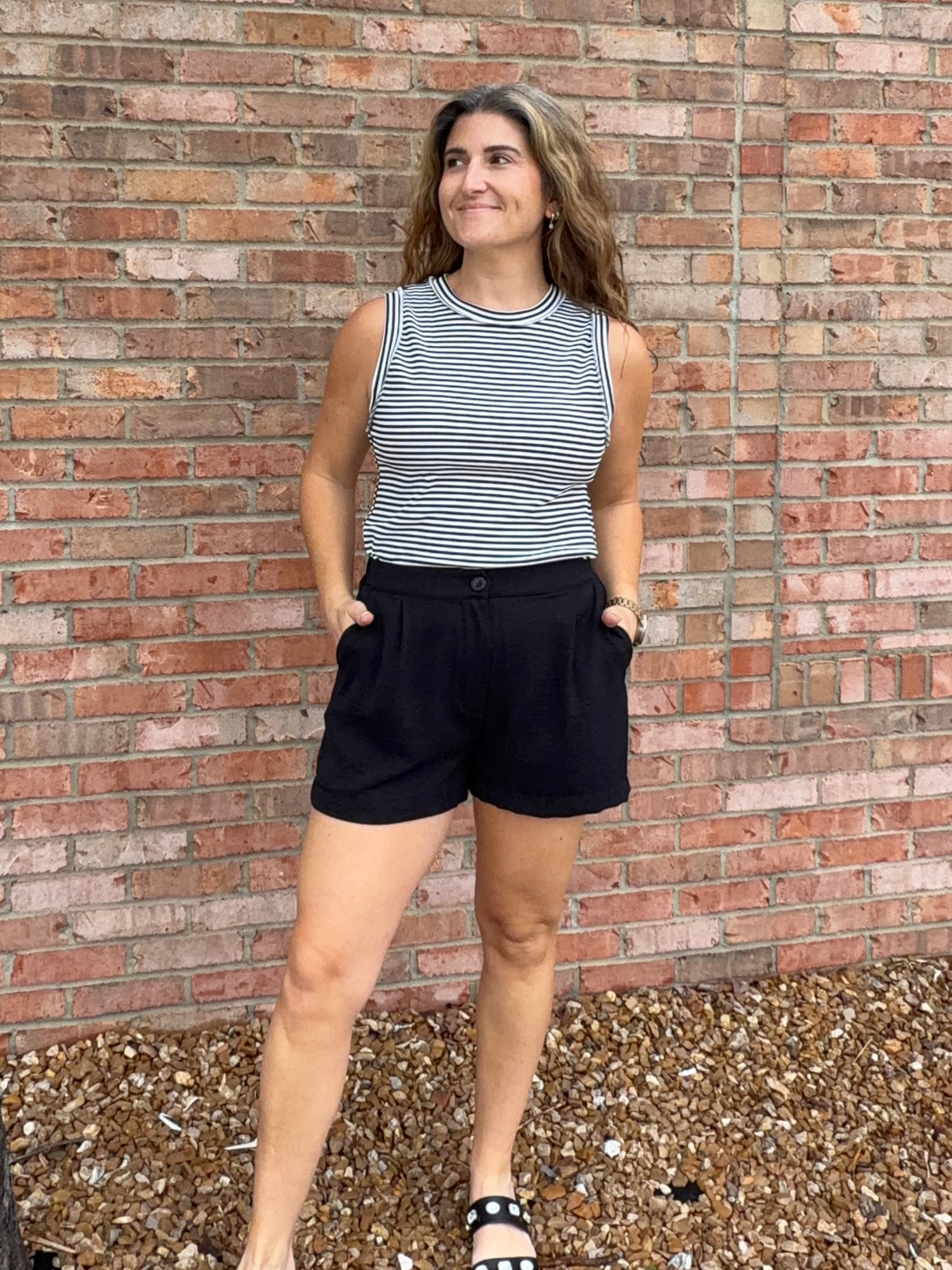 Black shorts with pleats featuring a smocked, elastic back for a comfortable fit! Hidden zipper fly and single button closure. Pockets.