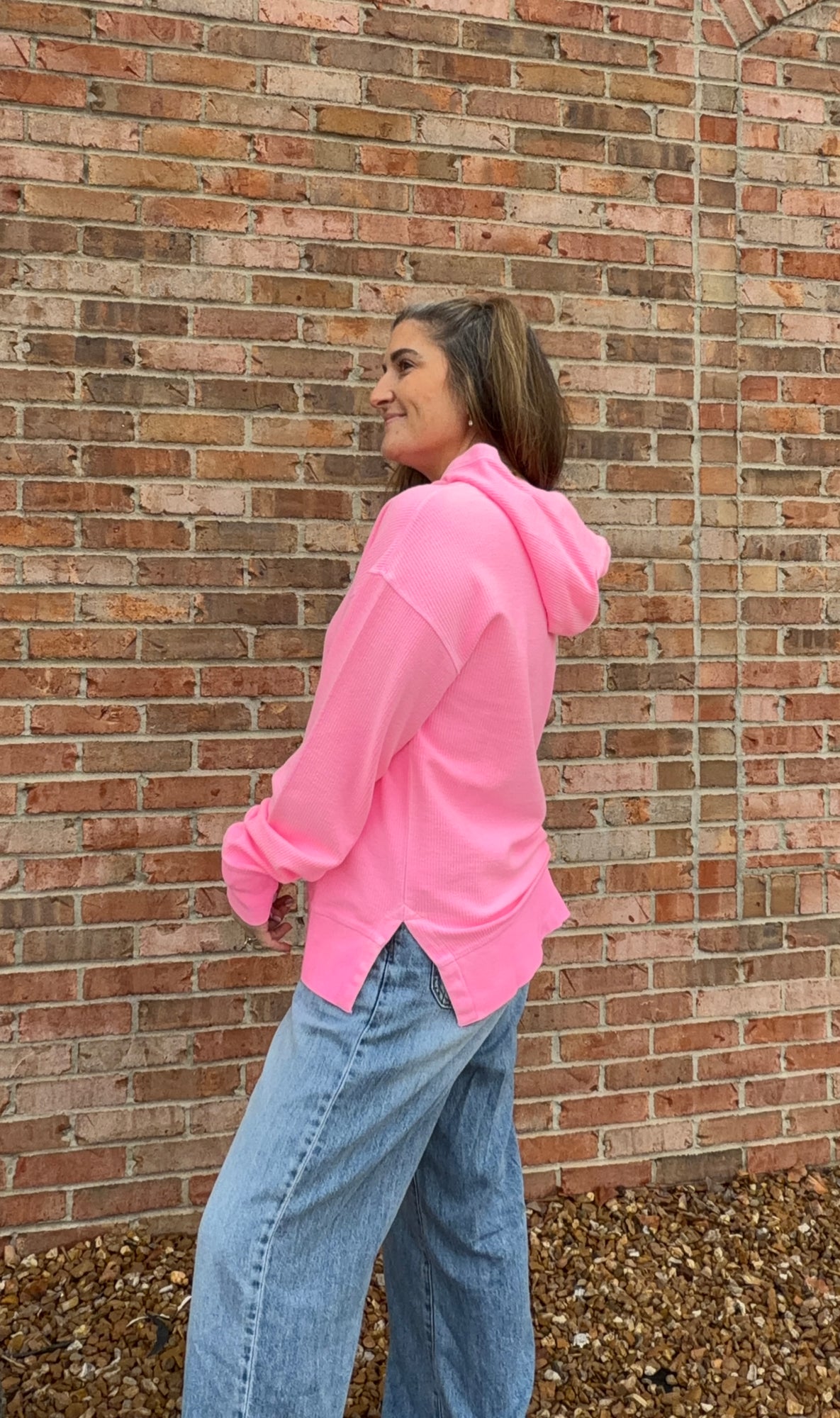 Our best selling corded crew top but with a hood! Features a very soft, ribbed material. Small side slits with a slight hi-low hemline.