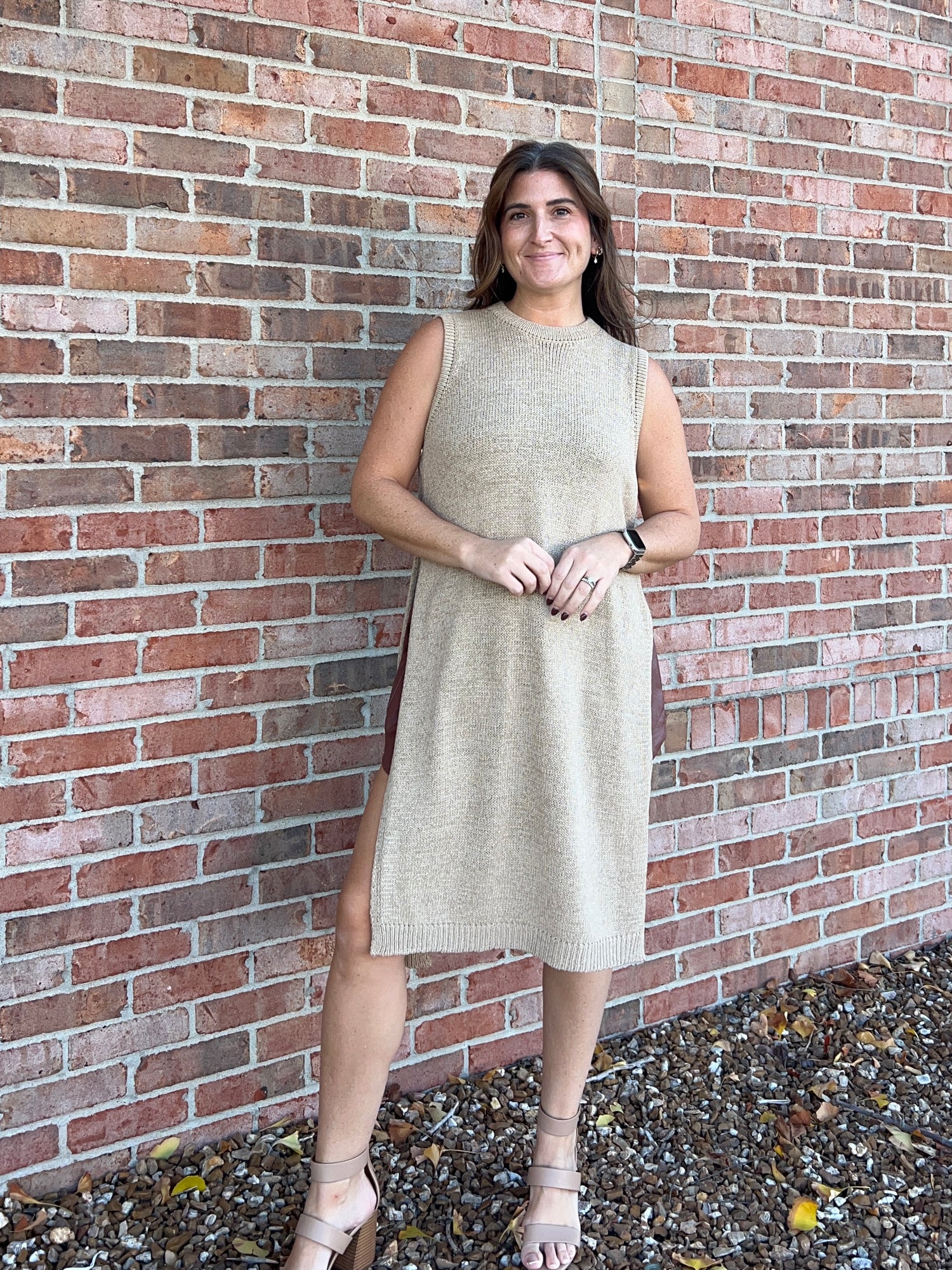 Sleeveless, lightweight sweater in a longer length with gold buttons on the side and an open, long slit. Available in beige and burgundy.