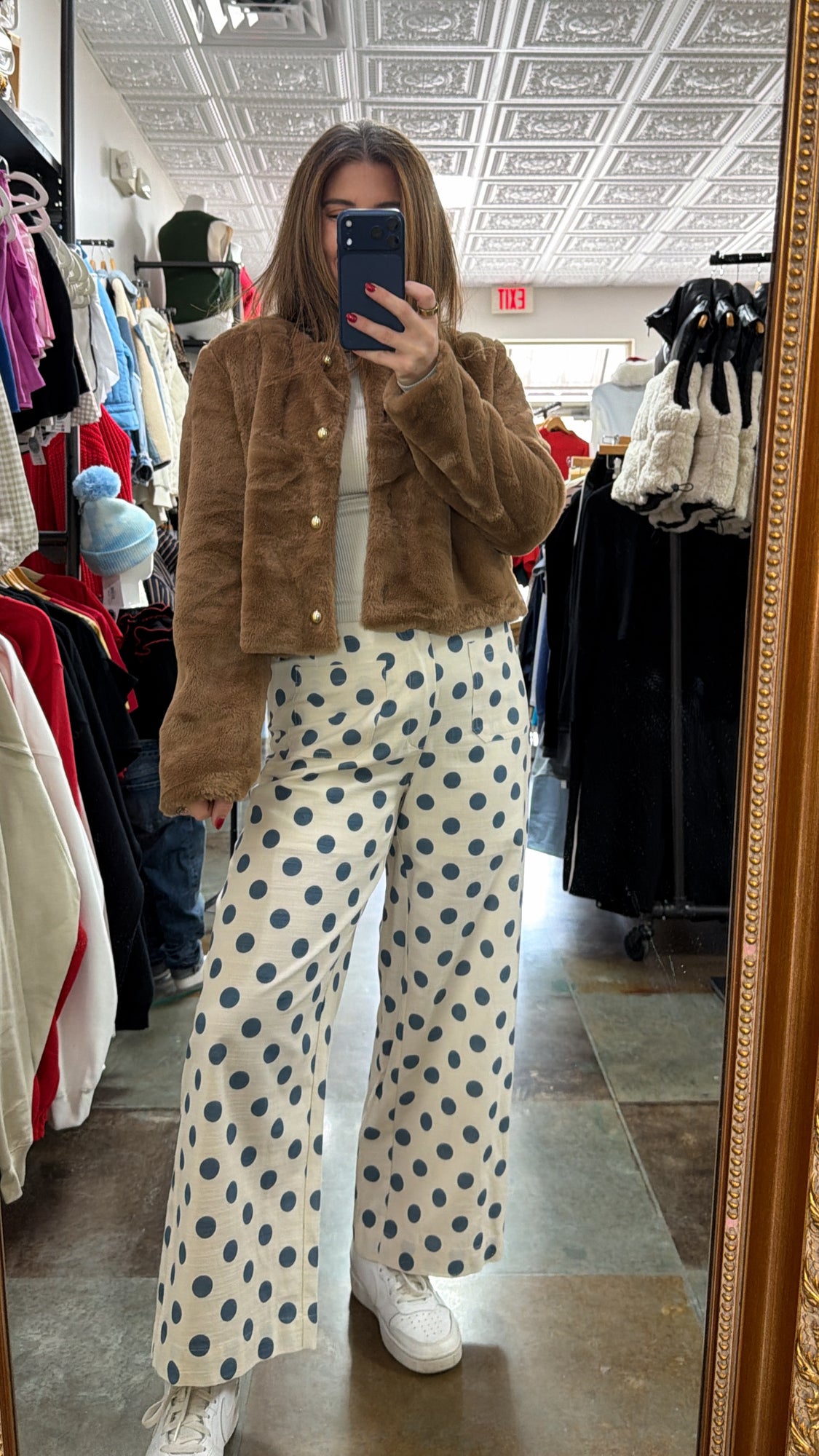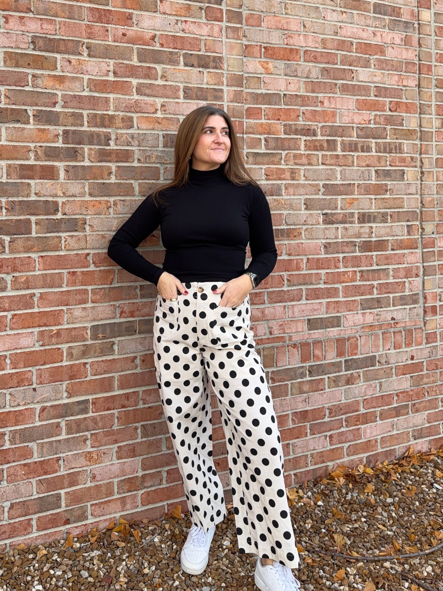 Pull on, high waisted pants in ivory with black polka dots throughout. Single zipper closure with button. No belt loops. Front and back pockets. Wide leg hem. Back waistband is elastic.