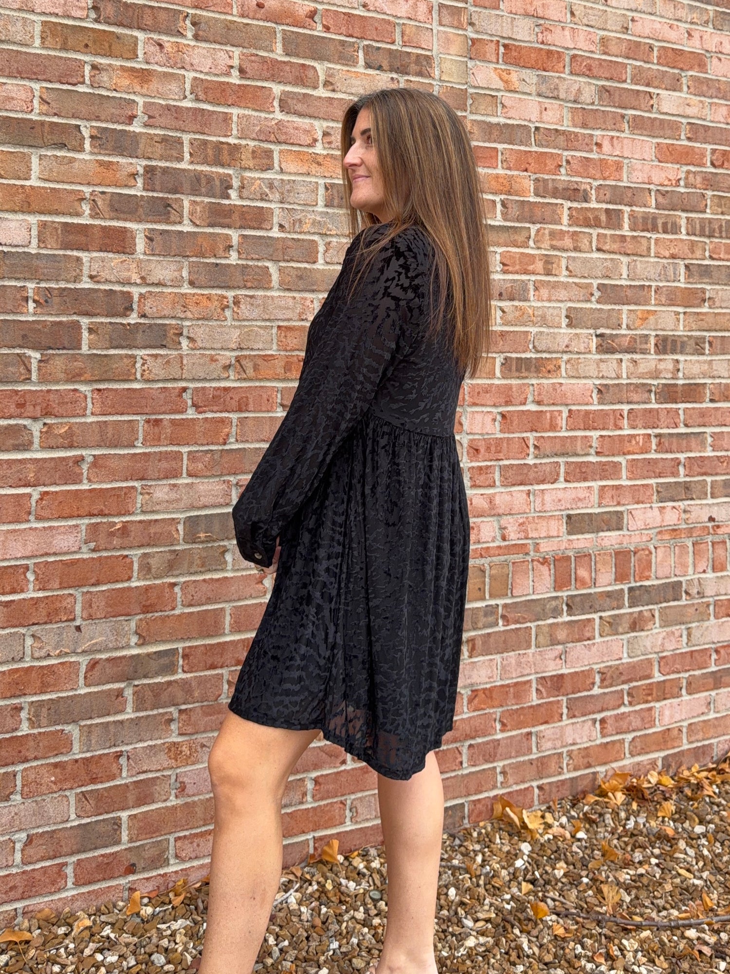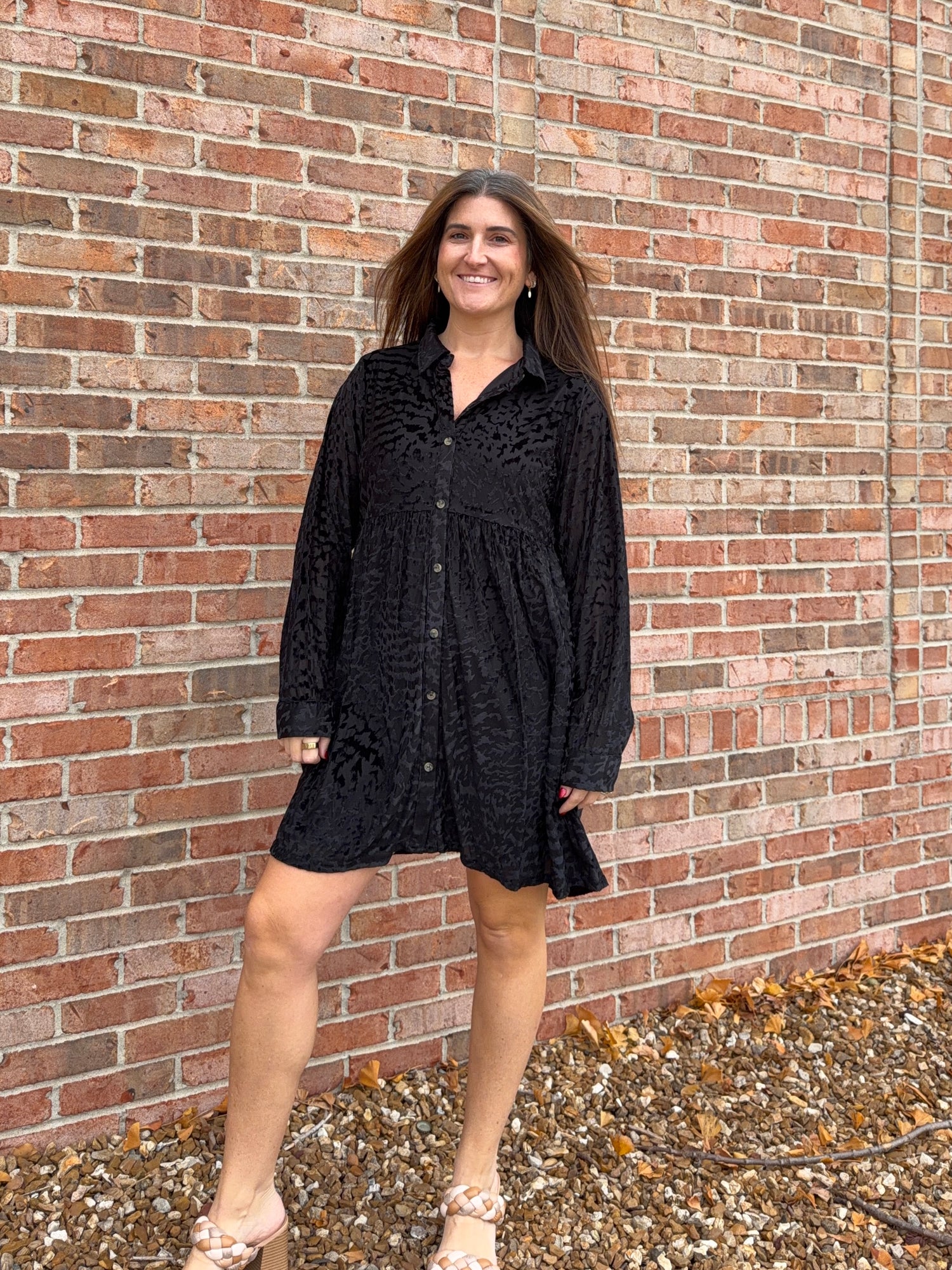 Long sleeve, black dress with a collar and button front. Textured, patterned velvet throughout. Fully lined.
