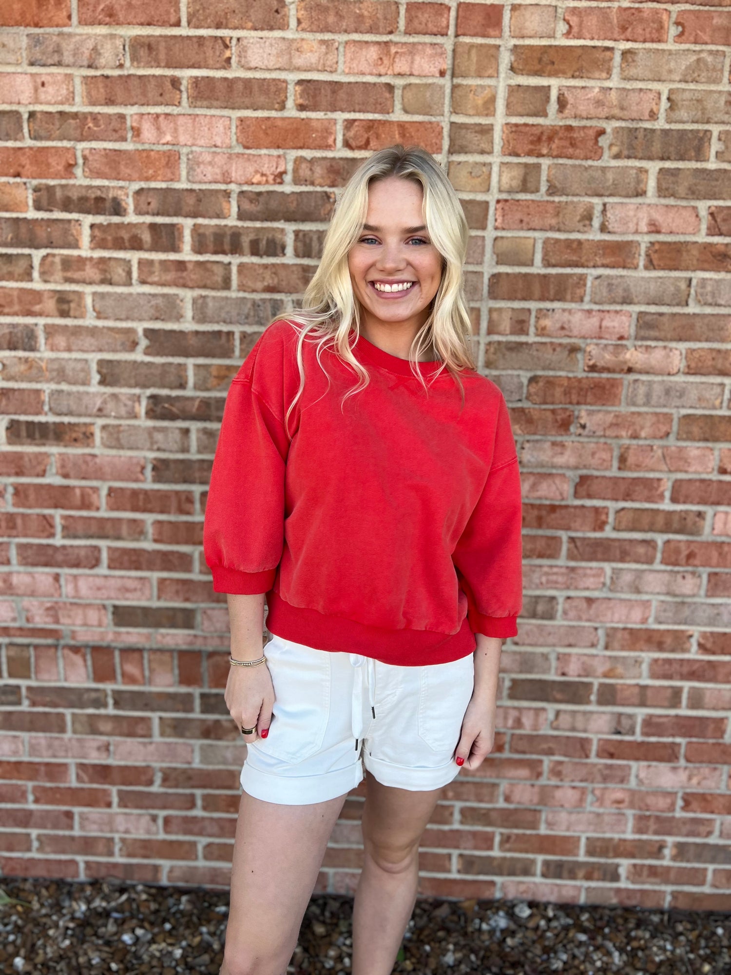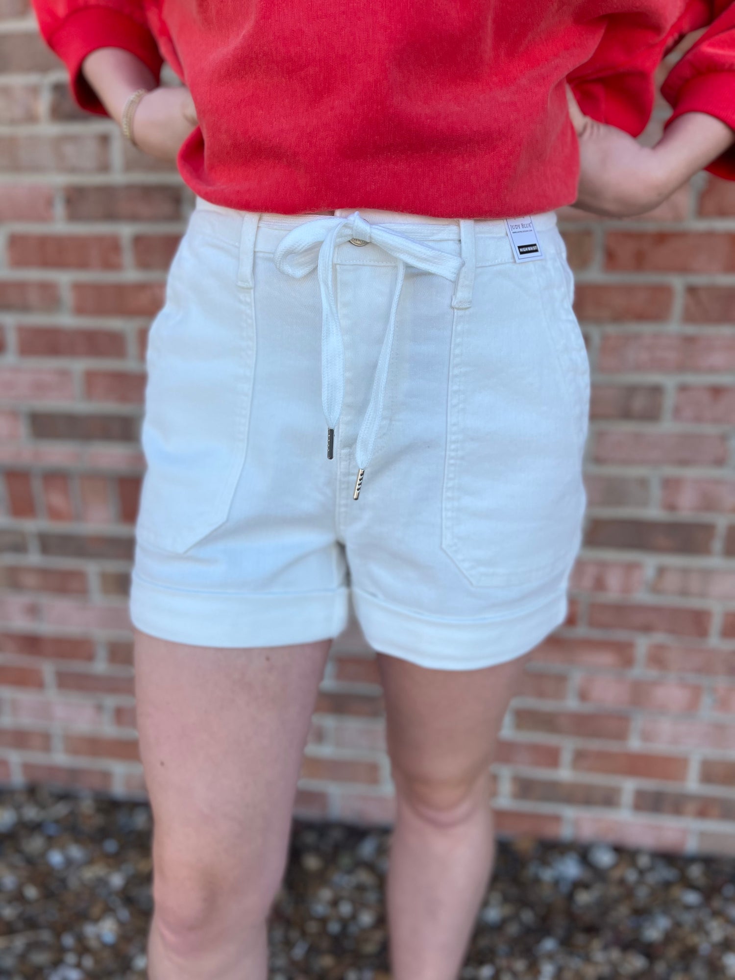 High waisted white shorts by Judy Blue with a cuffed hem and a jogger style waistband featuring a self tie bow. Classic pocket design with a single button closure and hidden zipper fly