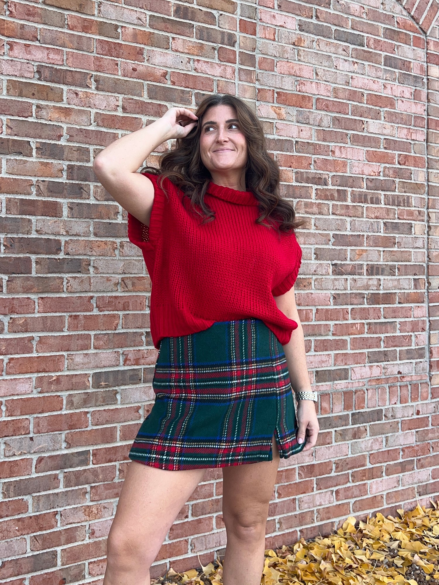 Short, cap sleeve sweater with a large, mock neck and a cropped hem. Ribbed detailing.