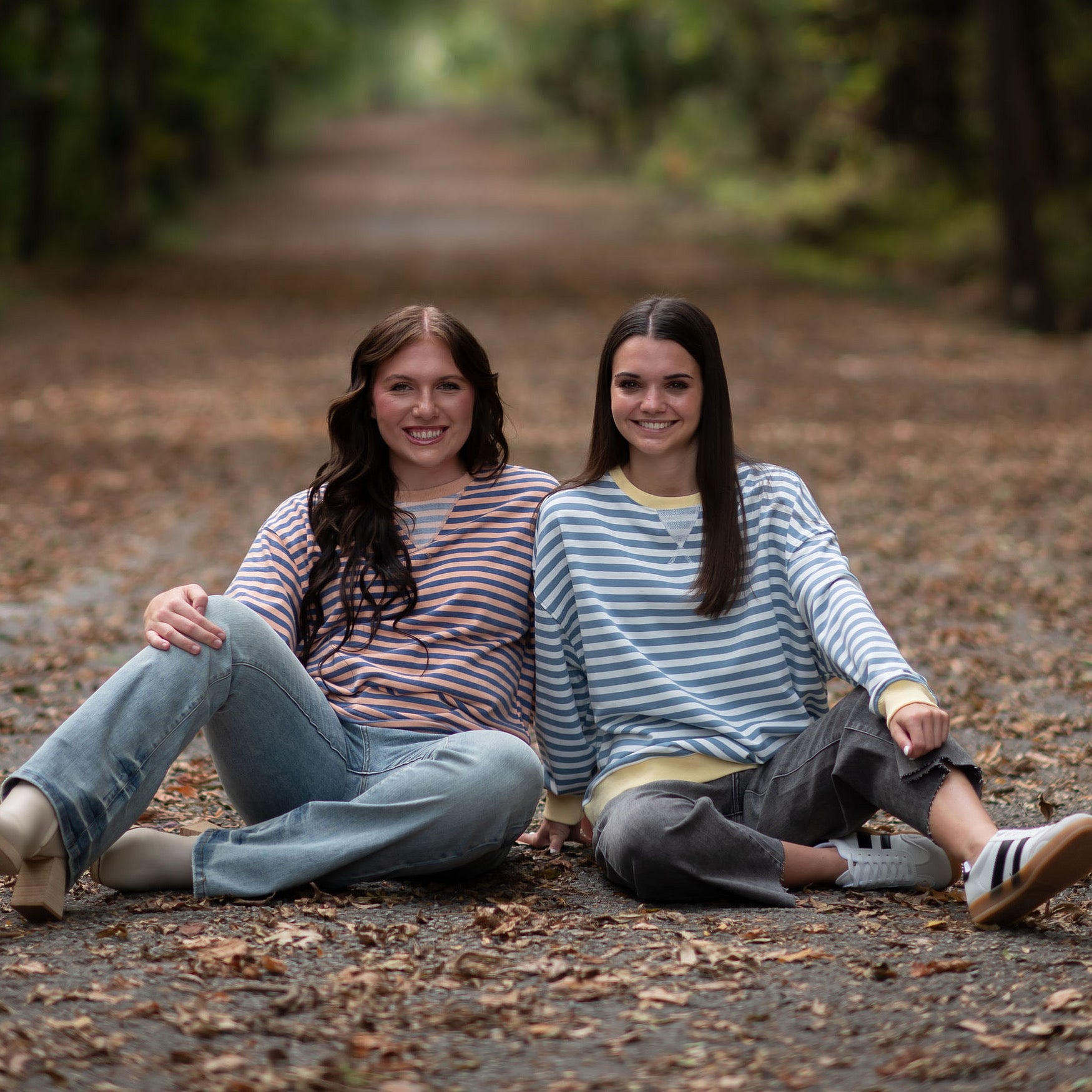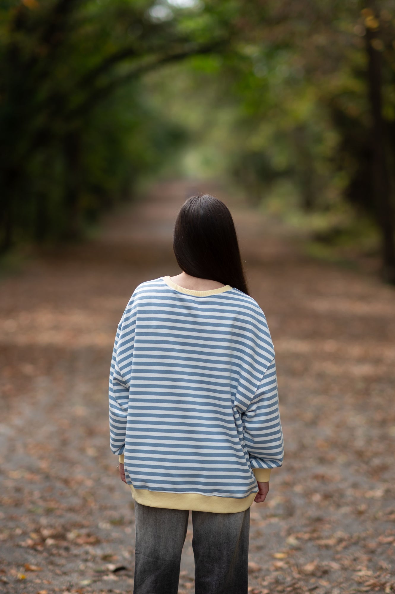 Long sleeve, blue and ivory stripes top with yellow contrasting trim. Relaxed fit.
