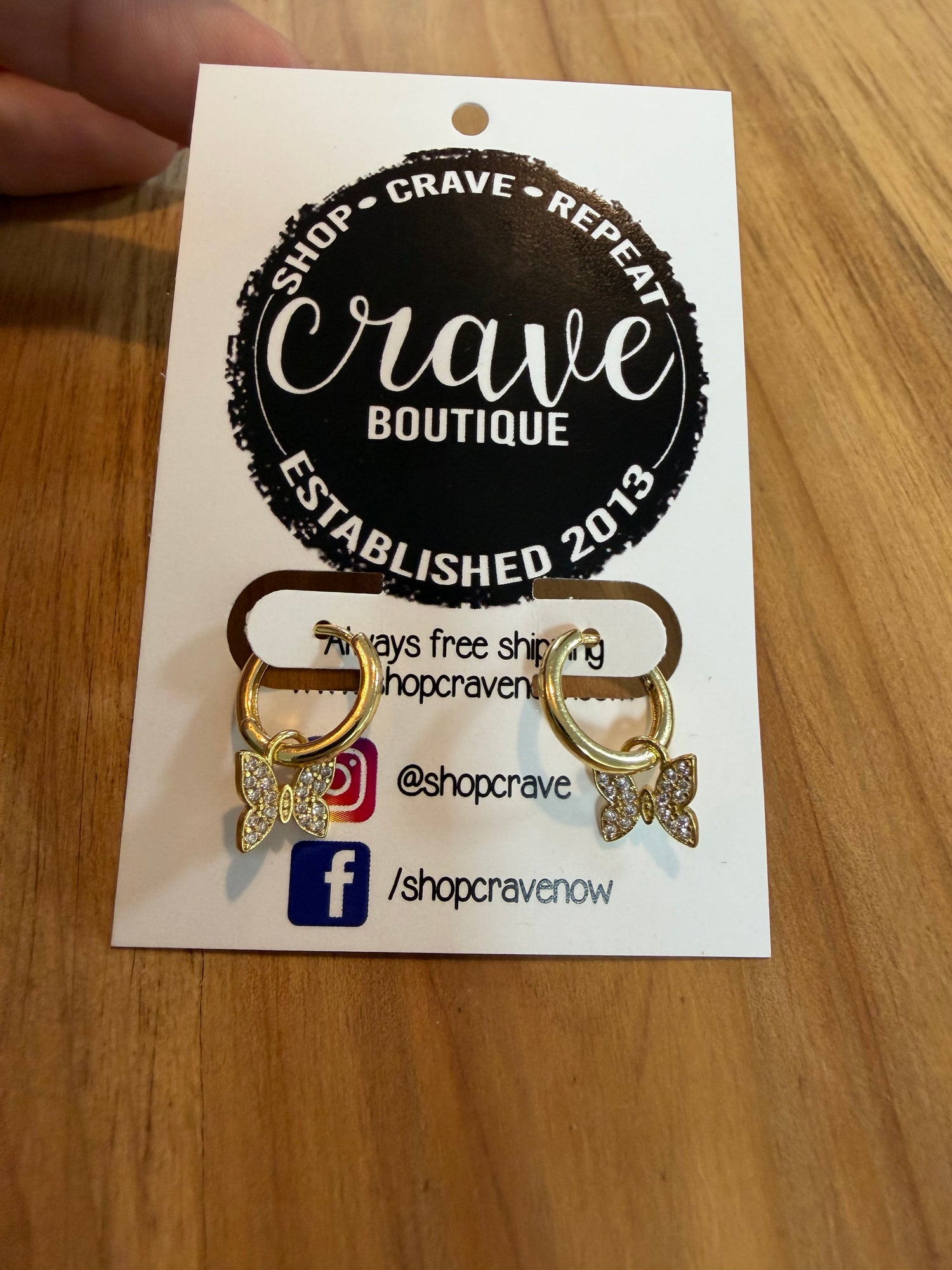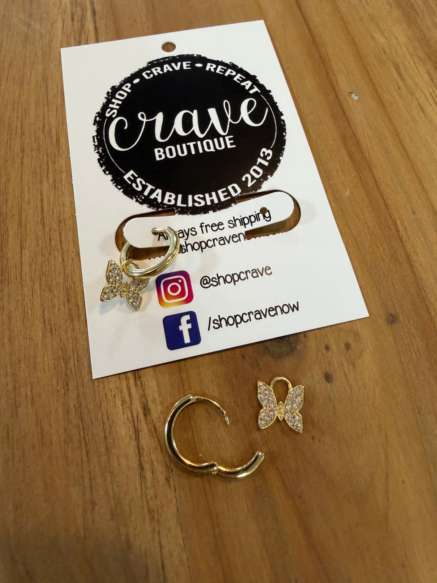 Gold dipped huggie hoop that closes into itself. Features a removable butterfly charm with cz rhinestones. Made of brass.
