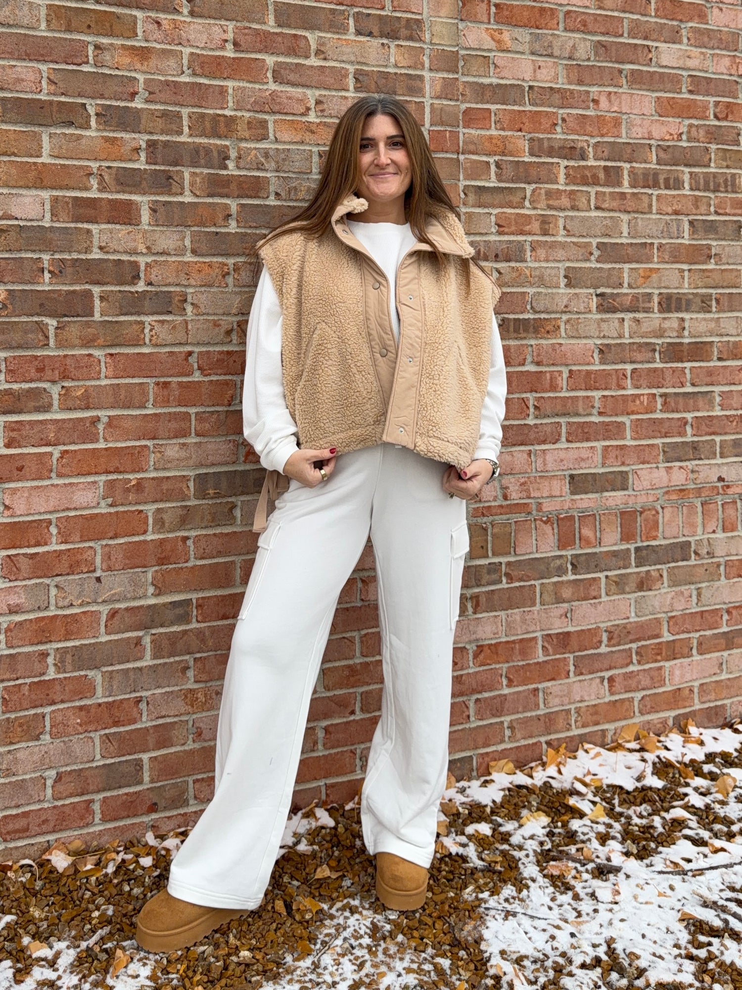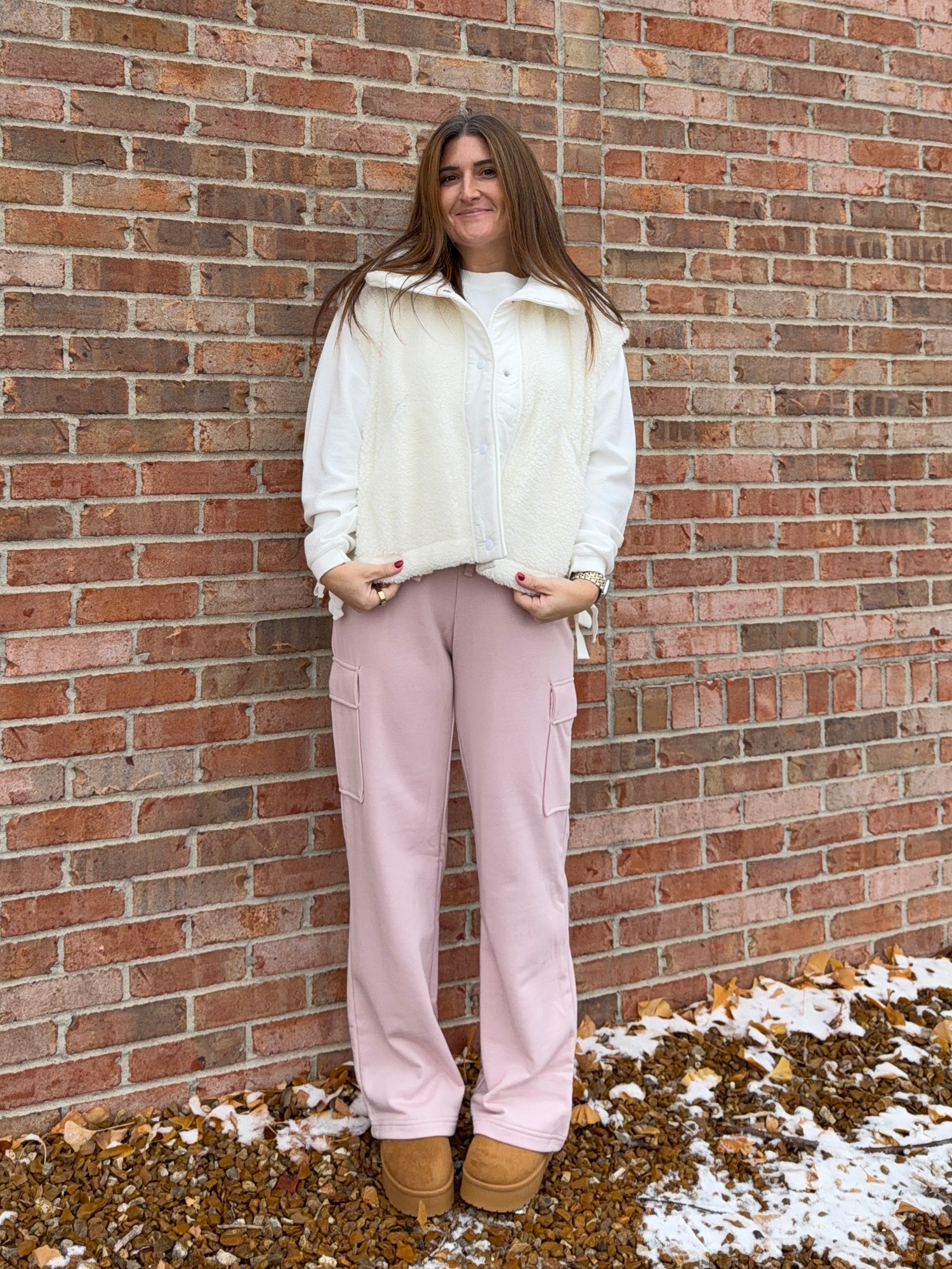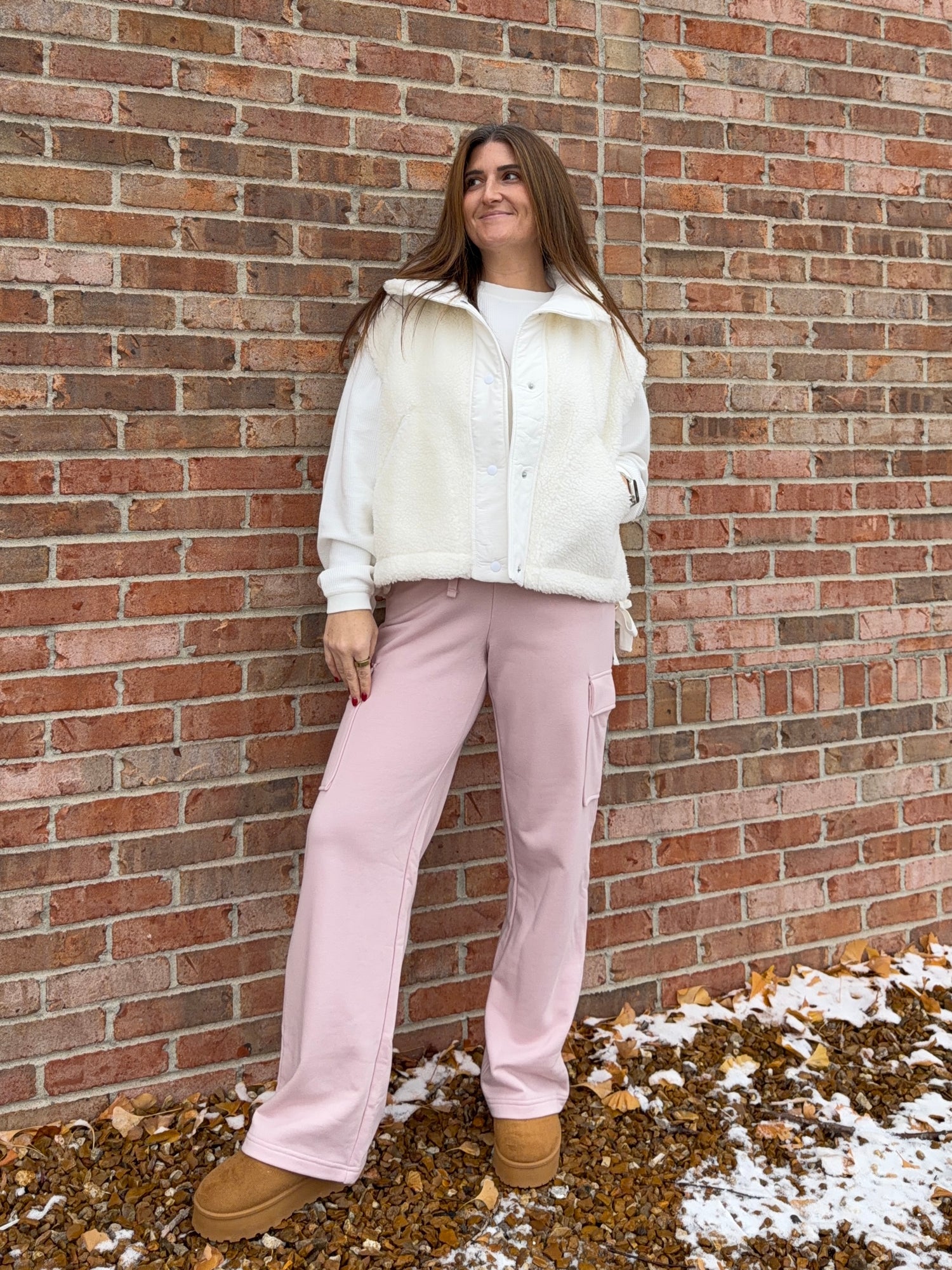 High waisted, pull on sweatpants with an elastic, drawstring waistband and cargo style pockets on the sides.