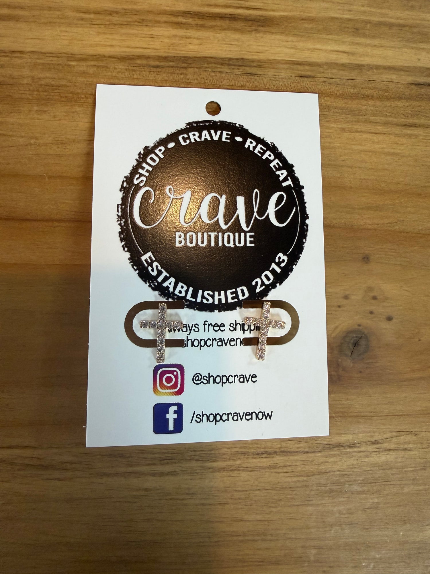 CZ rhinestone cross earrings on a stud post. Lead compliant. Gold dipped.